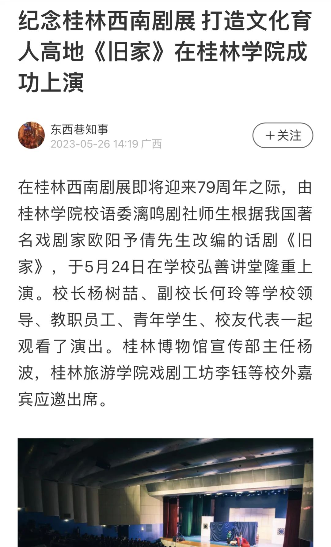 5月24日晚,在一阵阵热烈的掌声中,由校语委、人文学院、漓鸣剧社组织复排的“西南剧展”经典话剧《旧家》,再次在桂林学院弘善讲堂精彩上演。校长杨树喆,副校长何玲,桂林博物馆、桂林旅游学院、广西师范大学桂学博物馆等合作单位及兄弟院校嘉宾,教务与产教融合处、学生事务处(部)、后勤保卫处、人文学院、城市设计学院等校内单位相关负责人及全校师生代表,近500人共同观看了首场演出。