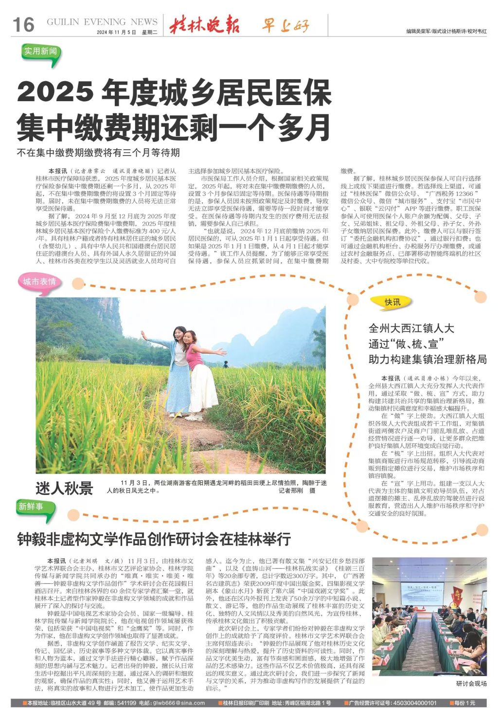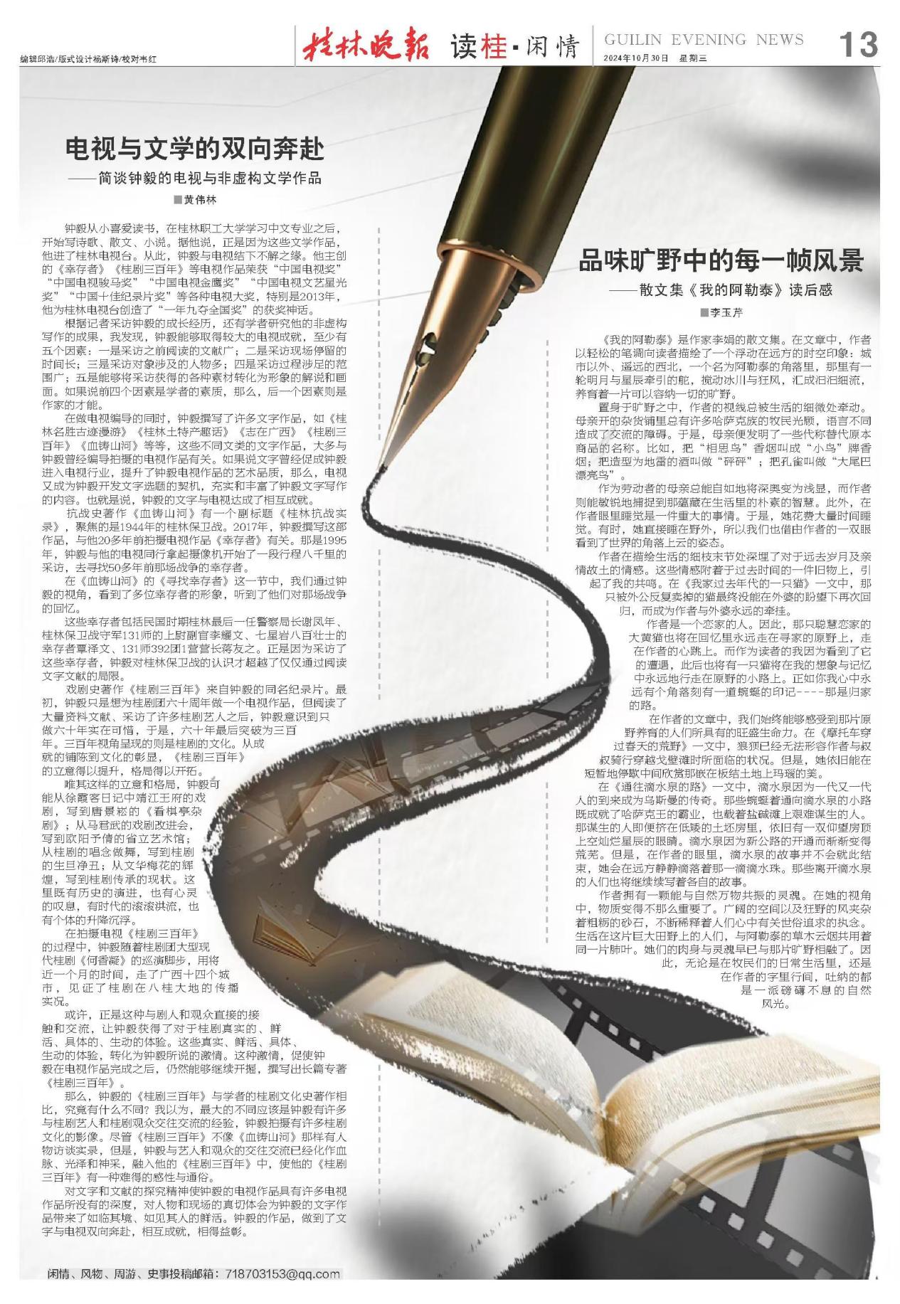 据悉,钟毅是中国电视艺术家协会会员、国家一级编导、桂林学院传媒与新闻学院院长、广西十佳电视艺术工作者、桂林市第三、四届“科技拔尖人才”,其作品《中国农民》《幸存者》《仙境桂林的奥秘》《桂剧三百年》《湿地人家》先后荣获“中国电视奖”“中国十佳纪录片奖”“金鹰奖”“中国纪录片评比一等奖”“广西铜鼓奖”等多项大奖。非虚构文学创作,是扎根于真实生活土壤的艺术之花。从报告文学到纪实文学,从传记到回忆录、历史叙事等。它以真实事件和人物为根基,用文学手法精心雕琢,赋予作品思想深度与艺术魅力。2015年,白俄罗斯作家斯维特兰娜·阿列克谢耶维奇获诺贝尔文学奖,让非虚构文学在全球大放异彩,其社会意义和文学价值被广泛关注。随后,这股风也吹到了中国,成为新闻传播学研究热点,引发平民化写作热潮。