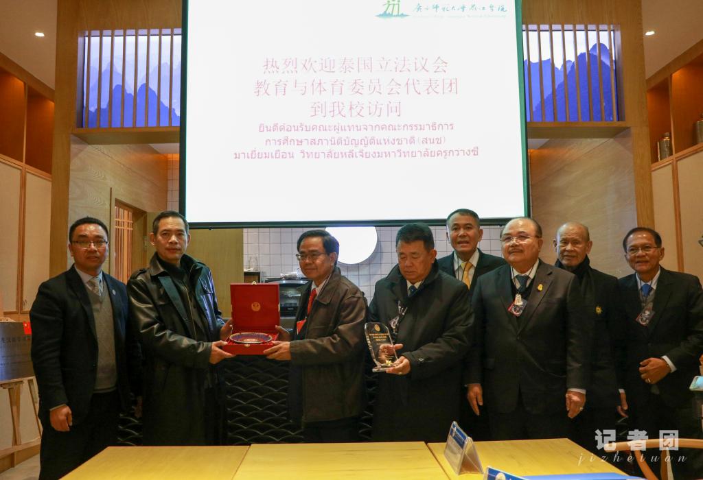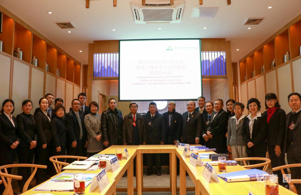 3月8日上午,泰国立法议会教育与体育委员会代表团一行19人到我校交流访问,校领导杨树喆、杨庆庆会见了代表团,双方在明善楼茶艺与酒水品鉴实训室就今后进一步扩大合作交流等事宜进行了座谈并举行了“泰国留学生汉语学习基地”授牌仪式。合作发展处、教学科研处、语言文学学院等单位负责人参加了座谈会。
