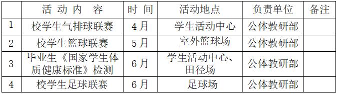 (二)积极开展校级体育竞赛活动(见本学期校级体育竞赛活动安排表),由体育与健康学院公共体育教研部牵头,各学院要密切配合、精心安排、认真组织参赛队伍,积极参加学校的各项体育赛事,确保学校各项体育竞赛活动的开展。