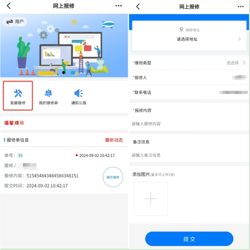 3.进入系统后,选择“我要报修”,根据选项,选择宿舍,报修类型,填入报修内容,点击“提交”即可提交报修单。