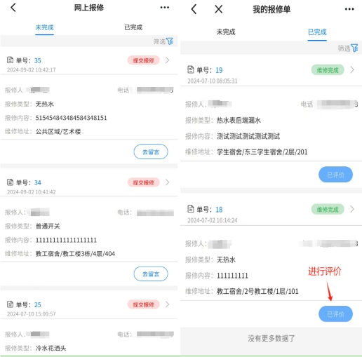 4.在“我的报修单”里能查看当前提交的报修,并可查看报修单处理进程。当师傅维修完成后,可在系统内对该维修单进行评价。