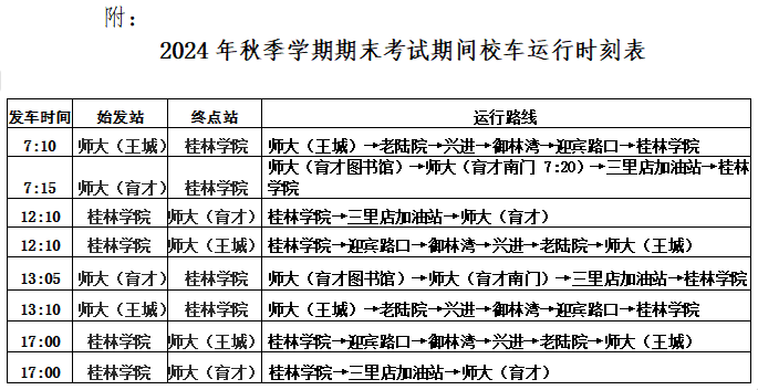 附:2024年秋季学期期末考试期间校车运行时刻表
