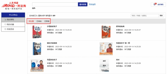 4、我的荐购:【个人中心】→【我的荐购】中可查看到所有的荐购书目,及图书馆的采纳情况。