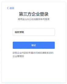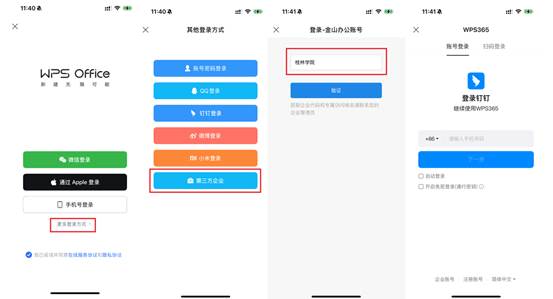 2.手机APP:打开WPS软件,选择[更多登录方式]-[第三方企业」,输入[桂林学院],点击[验证]后跳转到认证页面,通过钉钉账号登录后即可完成账号激活。