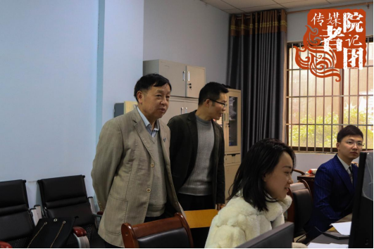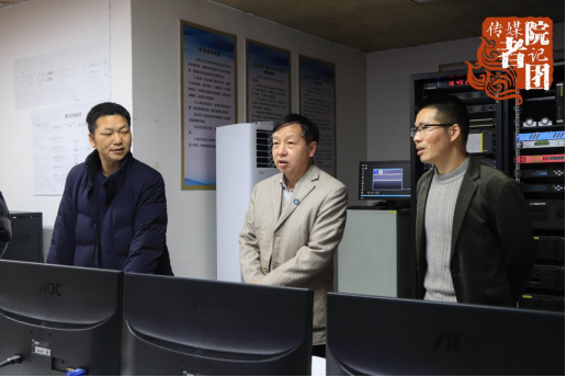 传媒与新闻学院院长钟毅在荔浦市融媒体中心领导的陪同下,参观机房中心