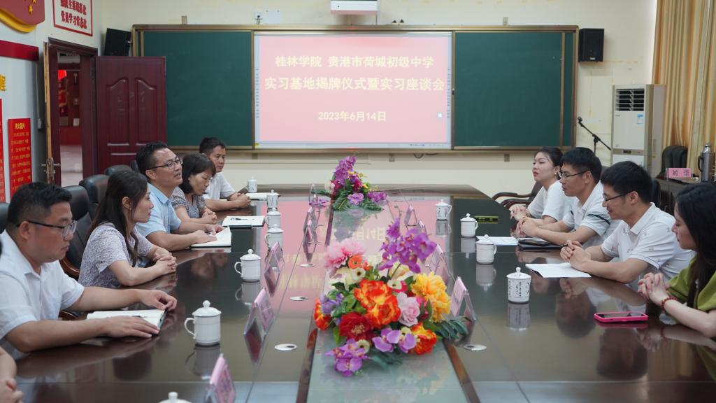 贵港市荷城初级中学秦海锋校长对学院一行的到来表示欢迎,向与会人员介绍了学校发展的整体概况,并表示希望能与桂林学院达成长期合作。刘显林副书记首先对荷城中学的大力支持表示感谢,并就学院发展历程、专业设置、教师队伍、人才培养等方面进行一一介绍。同时还介绍了桂林学院师范生专业方面的情况,希望通过建立教学实践基地,实现长期合作,打造教师发展和师范生教学实践的优质平台。随后双方就师范生专业方面人才培养、实践教学、人才需求等方面进行了深入的交流。