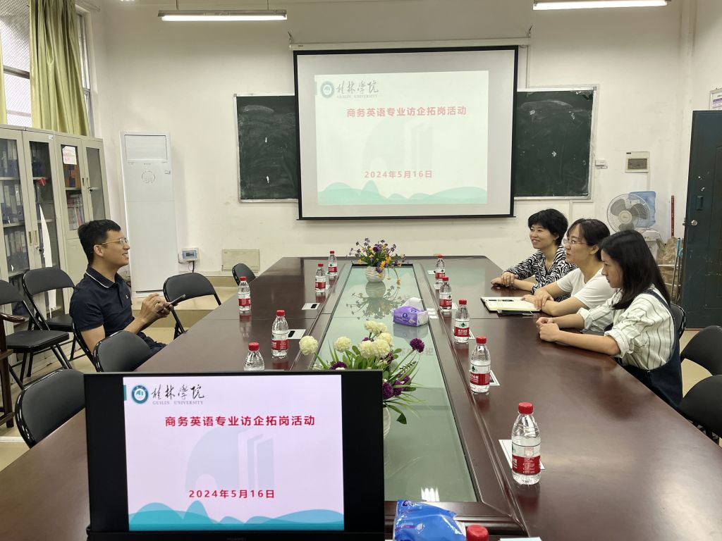双方就2021级商务英语专业的实习进行了深入探讨,确定了具体校招时间和方式,并提出了未来桂林本地专业实习和见习的基本框架。