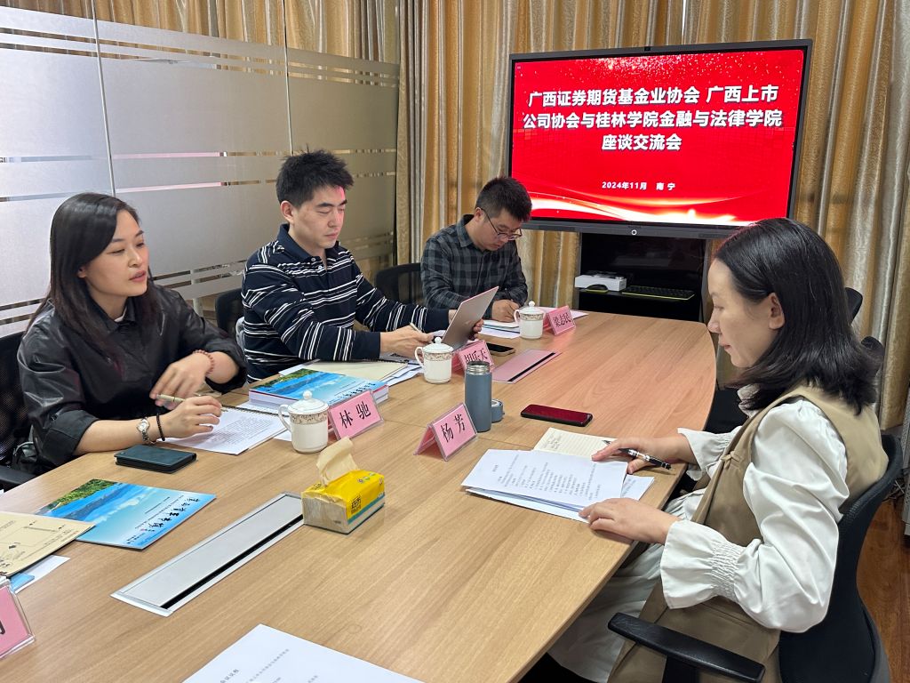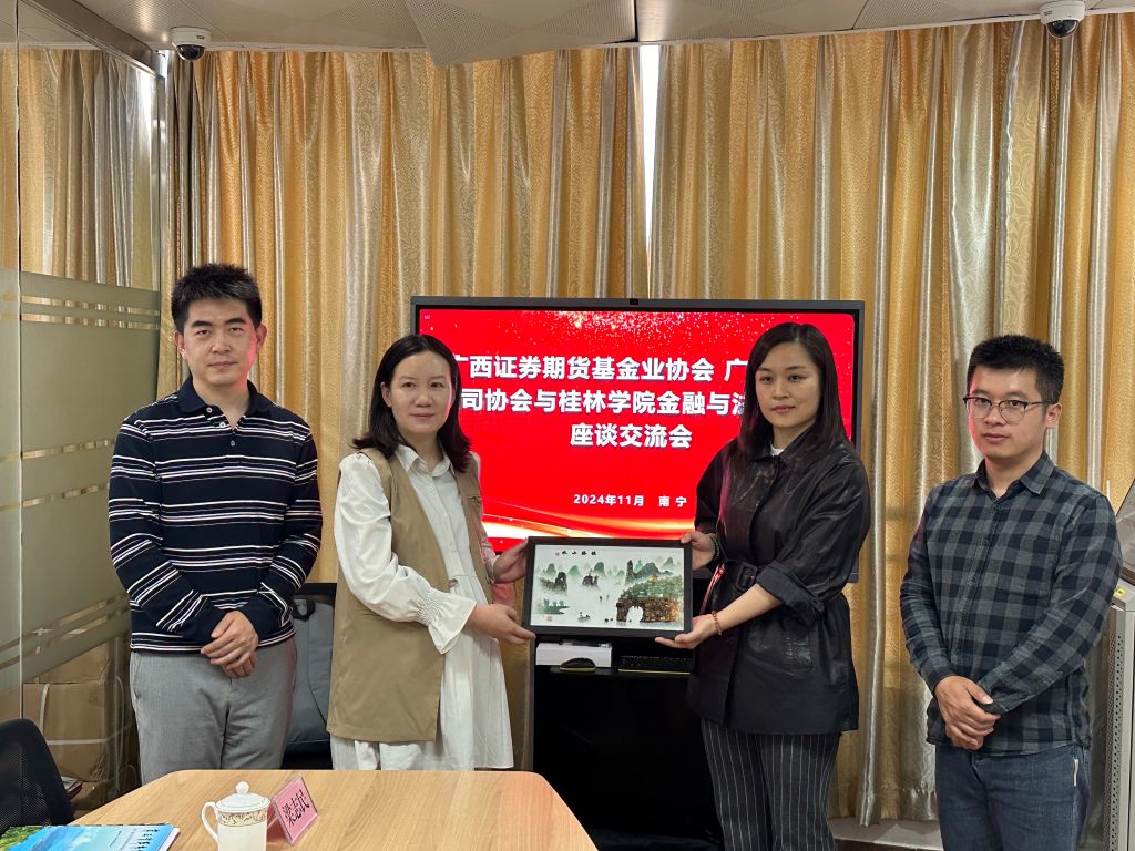 11月22日,金融与法律学院院长一行人至广西证券期货基金业协会洽谈合作交流。广西证券期货基金业协会副秘书长杨芳、陆青梅等人陪同接待并参加会议。