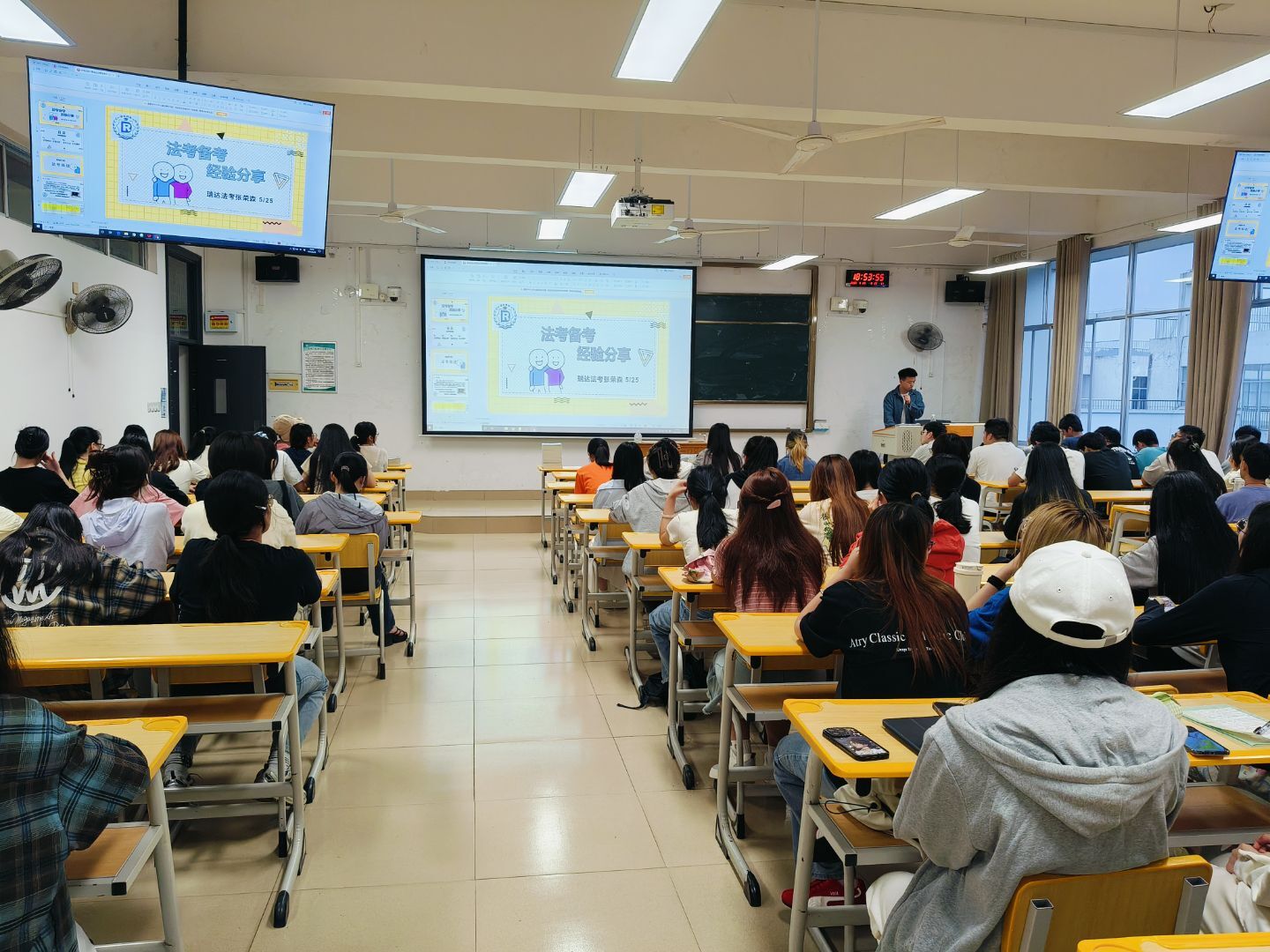此次培训邀请经验丰富的专业机构老师进行讲解,聚焦法考的重要意义、备考策略等关键内容,通过分析2025年广西区直岗位法学专业对法考证的需求数据,让同学们清晰认识到法考证在就业中的核心地位,从而激发他们备考的紧迫感与决心。同时,详细讲解时间安排与复习技巧,建议同学们遵循先理解型学科后背诵型学科的复习顺序,并根据不同阶段的特点合理规划学习任务。此外,培训还关注到同学们在备考过程中可能面临的心态问题,给出诸多建议,如做好“学不会”的心理准备、放弃安逸生活、少关注他人动态等,鼓励同学们以积极、平和的心态应对备考挑战。