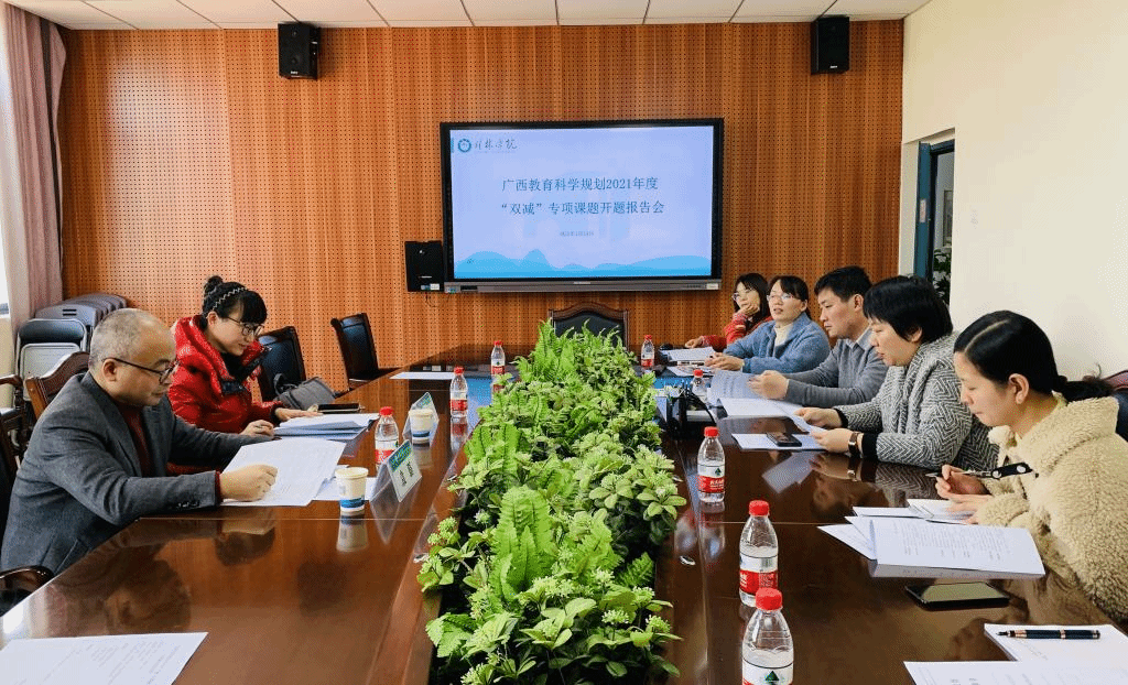 1月13日下午,我校广西教育科学规划2021年度“双减”专项课题开题报告会在知善楼8315会议室召开,广西基础教育研究院副院长袁磊教授、桂林市卓然小学科研发展中心陈燕虹主任受邀出席指导,立项课题所在学院院长、教学科研副院长、课题组成员、教学科研处等10余人参加了报告会,会议由杨庆庆副校长主持。
