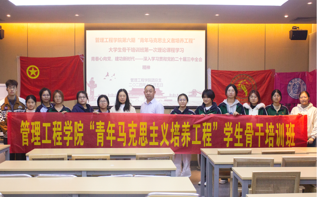 12月5日晚上,管理工程学院在杉湖家苑“一站式”学生社区辅导员工作室开展了第六期“青年马克思主义者培养工程”大学生骨干培训班第一次理论课程学习,此次学习以“深入学习贯彻党的二十届三中全会精神”为主题,本次理论学习由马克思主义学院院长进行授课,管理工程学院团总支书记、团总支学生会书记、主席团成员及青马班全体学员参加。