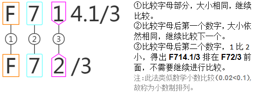 (1)先比较字母部分:A、B、C、D…Z,按字母顺序从A到Z依次排列。例:B12/5排在G12/5前面。