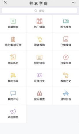 方法三:在手机上,关注桂林学院图书馆微信公众号,在页面中打开“服务门户” 中的“馆藏检索”