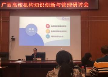 会议由贺州学院图书馆馆长韦浩明主持,贺州学院党委常委、副校长何星存,同方知网(北京)技术有限公司广西分公司总经理刘剑分别在研讨会上致辞。会议邀请了东北大学图书馆系统开发部主任刘畅和山东科技大学图书馆副馆长张福俊分别作了《高校机构知识库建设策略与实践》和《建设机构知识库,助推学校“双一流”建设》的主题报告。刘畅以东北大学机构知识库的建设为例,从前期调研、信息采集、人员组织、规则设置、学者反馈和宣传推广等方面进行详细讲解,并现场展示了东北大学的机构知识库平台。张福俊以山东科技大学为例,探索图书馆在角色定位方面的转换,从读者服务到图书馆服务的概念变化。他指出机构知识库的建立能够对学校、院系和学者的学术成果展示、科研选题和项目立项等有效评估,有利于图书馆长期保存机构学术成果、学科信息服务和知识产权信息服务等。