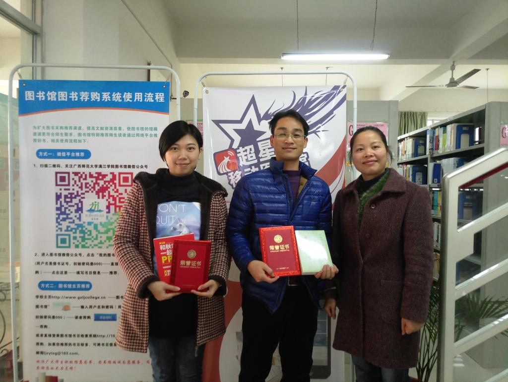 本年度图书推荐活动参与范围广泛,成效良好。截止到12月10日,共有106名师生参与了活动,共推荐图书601种,入选征订图书475种。根据全年荐购图书数量统计,图书馆李华鑫老师和中文系陈丕武老师分别以104种和78种的推荐数量获得一等奖,赵越超、庞仙梅等3名师生获二等奖,刘彩月、郭玉贤等6名师生获三等奖,陈黎昇、易小娴等9名师生获优秀奖。