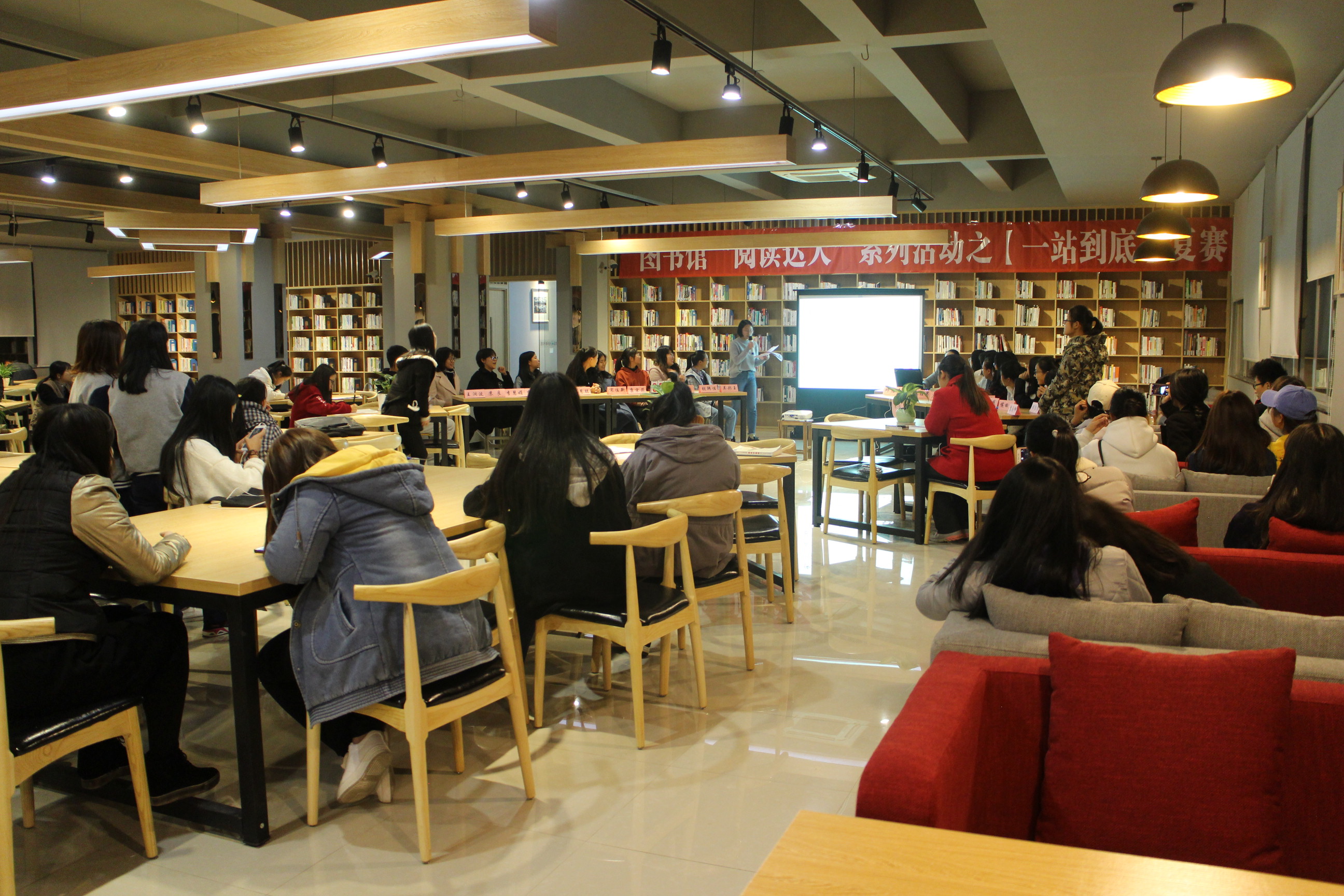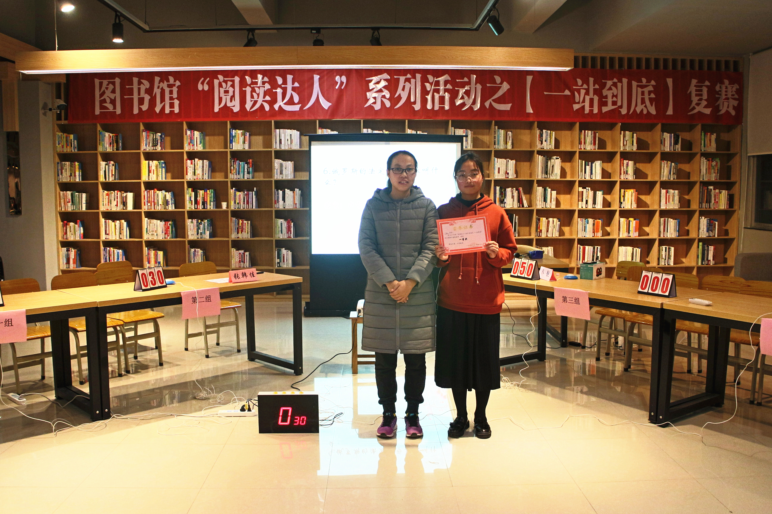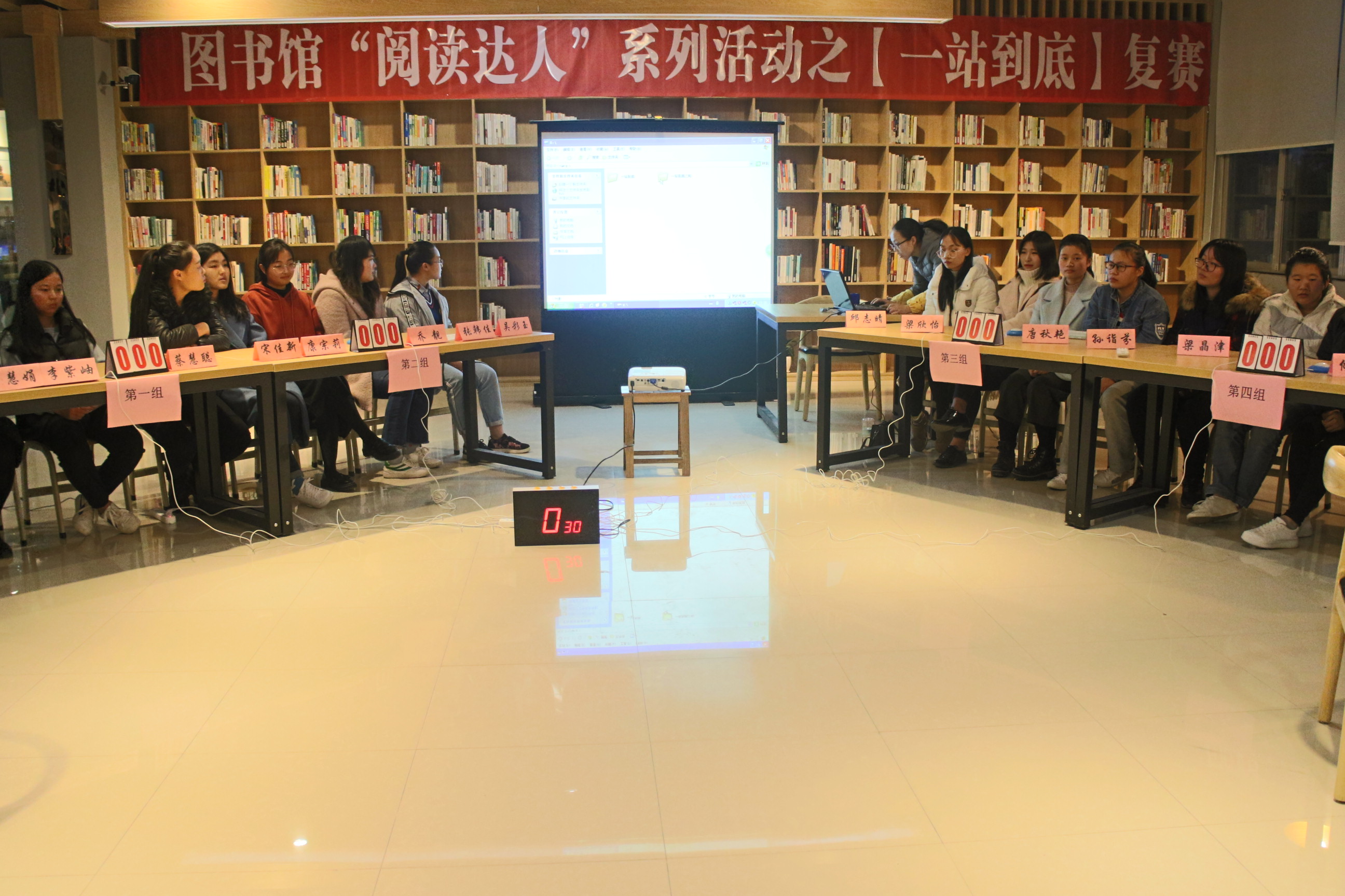 为了给广大同学提供展现自我才华的平台,图书馆11月底、12月初开展“一站到底”知识竞赛活动,共有60多名同学参与了比赛。经过第一轮的笔试答题初赛活动,20名选手晋级进入复赛阶段,12月11日晚图书馆组织晋级选手在图书馆多功能阅览室进行复赛,图书馆综合服务部老师和近100名学生到场观看比赛。