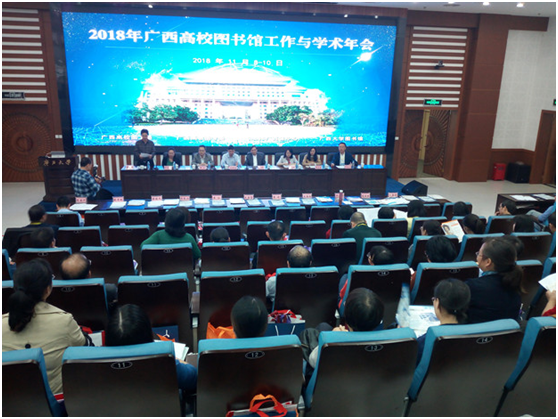 11月8—10日, 2018 年广西高校图书馆工作与学术年会在广西南宁举行,由广西高校图工委、广西高教图专委和CALIS广西文献信息服务中心广西大学图书馆共同举办。全区近50所高校140名代表参加了此次年会,我校图书馆参加了此次年会。