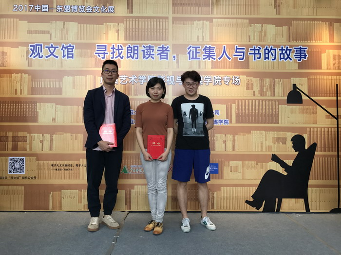 14日晚上9点,陈嘉乐老师、李华鑫老师、郝嘉辉同学与师大出版社“观文馆”活动负责人就4月21日广西区内的“10城20校”活动及4月23日的全国100所学校的阅读活动进行沟通交流。15日上午10点,在南宁会展中心D区2层13号馆,所有参会高校校园导师与小馆主观摩了“观文馆 经典共读”广西艺术学院影视与传媒学院专场活动。