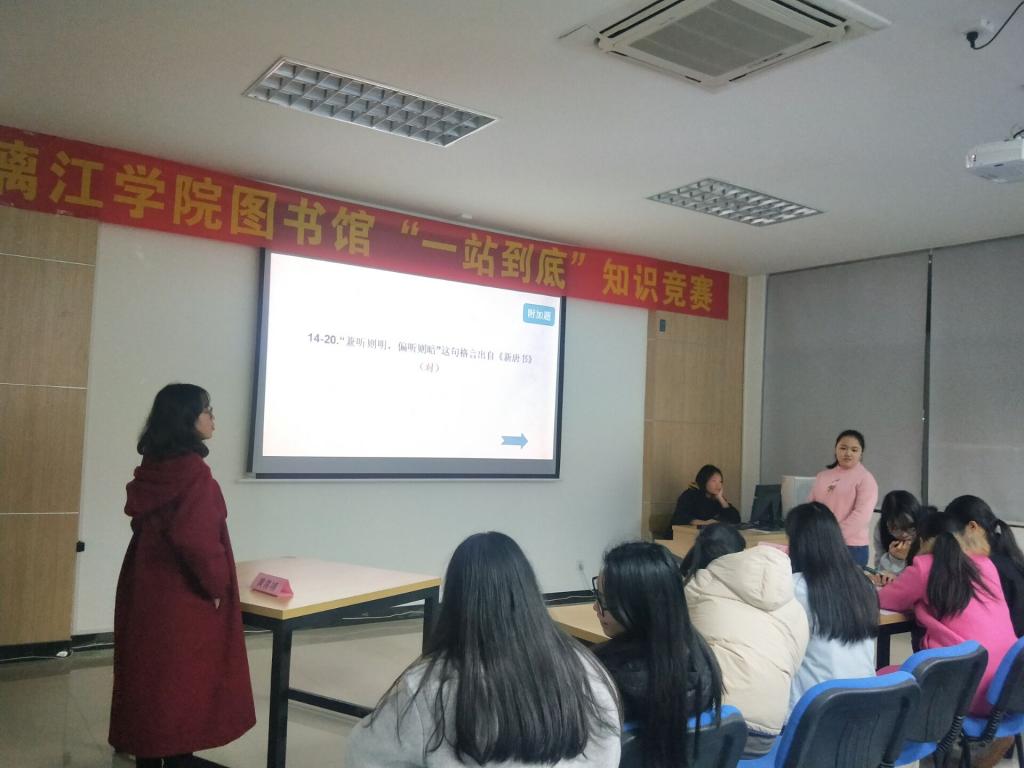 为了促进学生综合素质全面发展,营造浓厚的校园文化氛围,给读者提供一个展现自我才华的平台,图书馆特举办“一站到底”知识问答比赛活动。经过前期初赛、复赛,20名同学最终入围决赛。12月20日在多功能阅览室报告厅举行了知识竞赛决赛,部分馆员和弘毅读书社的同学担任本次决赛的评委、计时和记分员。