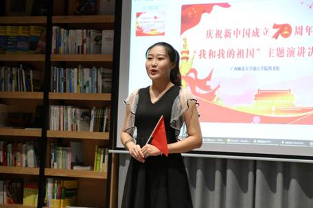 在举国同庆中华人民共和国成立七十周年华诞之际,由图书馆举办的以 “我和我的祖国”为主题的演讲比赛决赛,9月29日晚在独秀书房(漓院店)举行,活动旨在通过演讲这一形式,让同学们讲述自己对祖国的热爱,对祖国发展取得成就的自豪,弘扬爱国主义精神,坚定四个自信,激发同学们的爱国情和报国志。