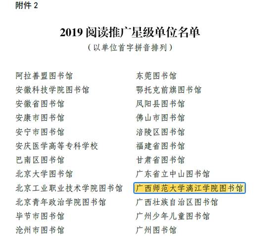 近日,中国图书馆学会发布了《中国图书馆学会关于公布2019阅读推广星级组织和星级单位的通知》(中图学字[2020]17号),广西师范大学漓江学院图书馆被中国图书馆学会授予“2019阅读推广星级单位”,这是中国图书馆学会对我校图书馆开展全民阅读推广工作的肯定。