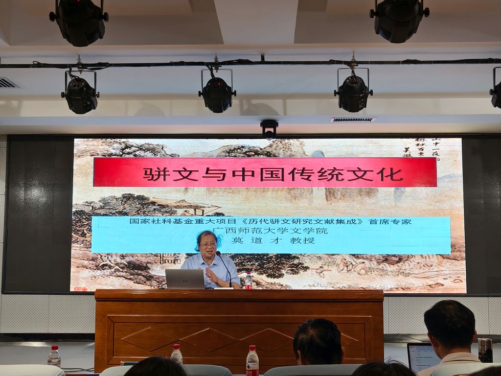 莫道才教授从七个方面叙述了骈文与中国传统文化的关系。莫教授指出:骈文是一种对偶修辞的写作篇章方式,是中国古代书写系统的书面写作方式,是中国传统“文”的观念的典型体现;同时,骈文也是中国人的思维方式的体现,是中国传统文化的重要载体;骈文蕴含了中国传统文化的话语规则,体现了中国传统文化的博大精深。