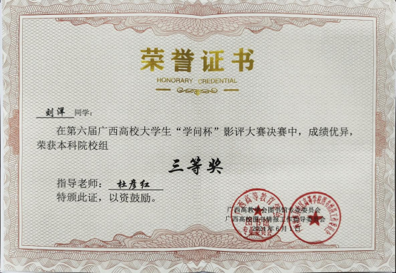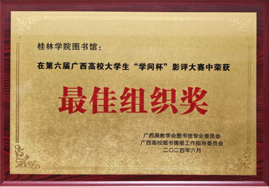 6月1日,以“礼敬中华传经典 培根铸魂育新人”为主题的第六届广西高校大学生“学问杯”影评大赛决赛在桂林旅游学院图书馆成功举行。本次大赛由广西高教学会图书馆专业委员会和广西高校图书情报工作指导委员会主办,桂林旅游学院承办,广州红霖信息科技有限公司协办。我校晋级决赛的传媒与新闻学院刘洋、人文学院王清合两位同学荣获本科院校组三等奖。我校还获得了最佳组织单位奖,杜彦红老师获得最佳组织个人奖。