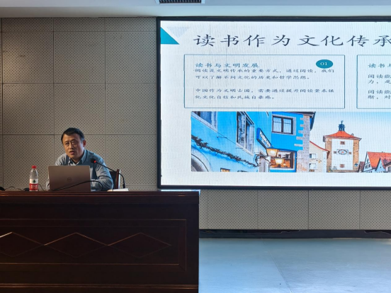 讲座由人文学院院长主讲。讲座伊始,人文学院院长以“我校各学院阅读情况报告和2023各国读书数据报告”为引子,引发大家对当前我国阅读情况的思考。他指出,阅读是文明传承的重要方式,通过阅读,我们可以了解不同文化的历史和哲学思想。中国作为文明古国,需要通过提升阅读量来强化文化自信和民族自豪感。