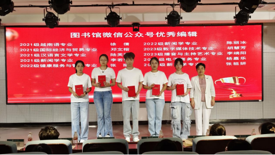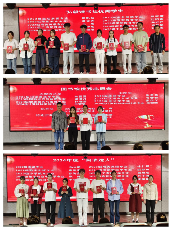图书馆负责人回顾了上一年度图书馆组织开展读书活动情况以及同学们所取得的阅读成果,介绍了2025年“读书月”将开展的内容和形式多样的阅读推广活动,她希望广大同学积极参与读书活动,多读书,读好书。随后进行了诗歌朗诵、阅读倡议、优秀读者表彰等活动环节。2023级播音与主持艺术专业学生倾情演绎诗朗诵《书页里的光》,传递“以文字照见精神世界”的深刻意境;弘毅读书社和图书馆微信公众号团队联合发出阅读倡议,号召全体师生“做精神高地的追光者”;对2024年度“阅读达人”、图书馆优秀志愿者、弘毅读书社及图书馆微信公众号优秀学生的表彰,则激励了师生阅读的热情。