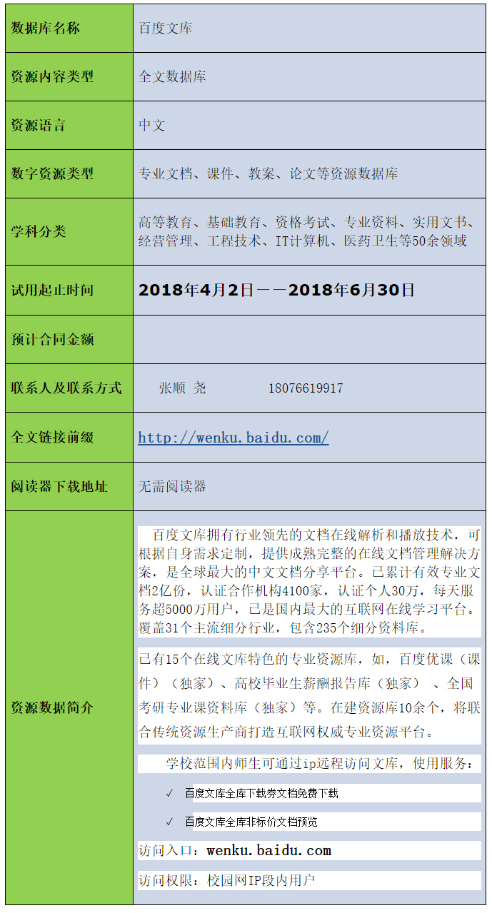 为进一步满足我院师生的文献资源需求,丰富我校电子资源,即日起面向我院师生开通试用《百度文库》电子资源。