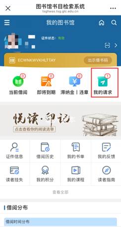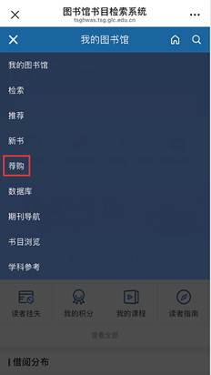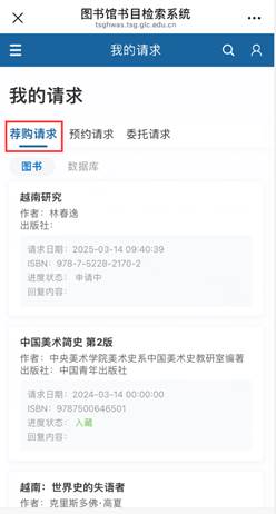 打开桂林学院图书馆微信公众号,点击“服务门户”,在个人主页“我的请求”中查询荐购图书进度信息。(如荐购图书显示“入藏”,两日后可到A馆荐购书架借阅。)