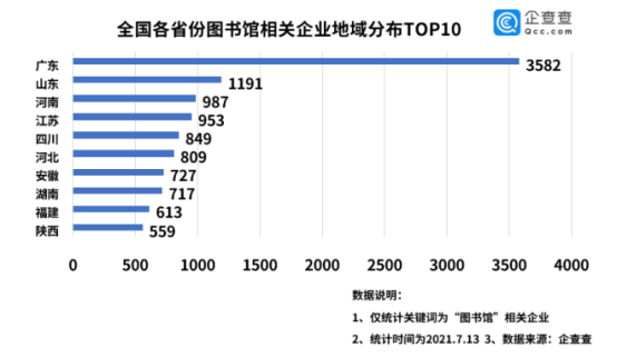 从地域分布来看,广东省以3582家位列第一,超过了第二名的山东省3倍多,同时在全国范围内占比达到21%,体量惊人。此外,山东、河南、江苏、四川等人口、经济大省也处于前五的位置。从侧面来说,人口的密度与图书馆的数量有一定关联。