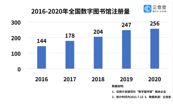数字图书馆占比1/7,近年来发展迅猛。企查查数据显示,目前全国现存2234家数字图书馆相关企业,约占到全国图书馆总量的1/7。其中2016—2020年注册量合计为1029家,约占到总量的五成。