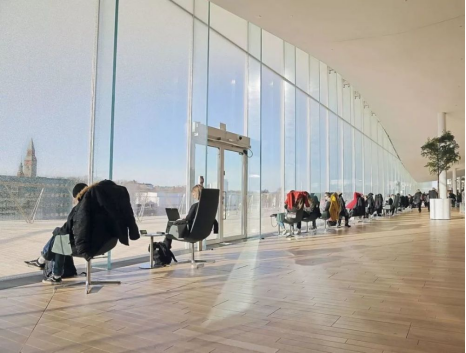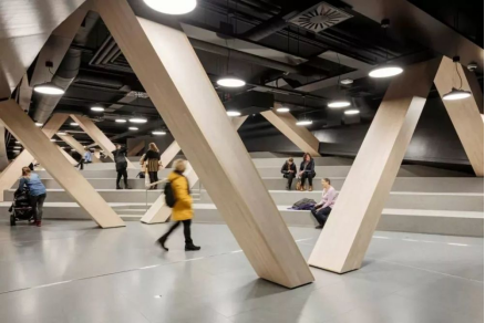 图书馆设计之初,曾向市民们征集想法:这座图书馆为谁而建?评委们把这些答案收集起来,以艺术创作的形式展现在楼梯上,一共400个词,告诉大家,这座图书馆为所有人而建。走在这个楼梯上,外来参观者的内心会感到震撼:平等和公民权利不仅仅是口号,而是踏踏实实地行动。二楼在桥梁桁架之间灵活设置了很多小房间,满足男女老少工作和娱乐休闲各方面需求。自由职业者可以免费租一个空间办公或者开团体会议都没问题。