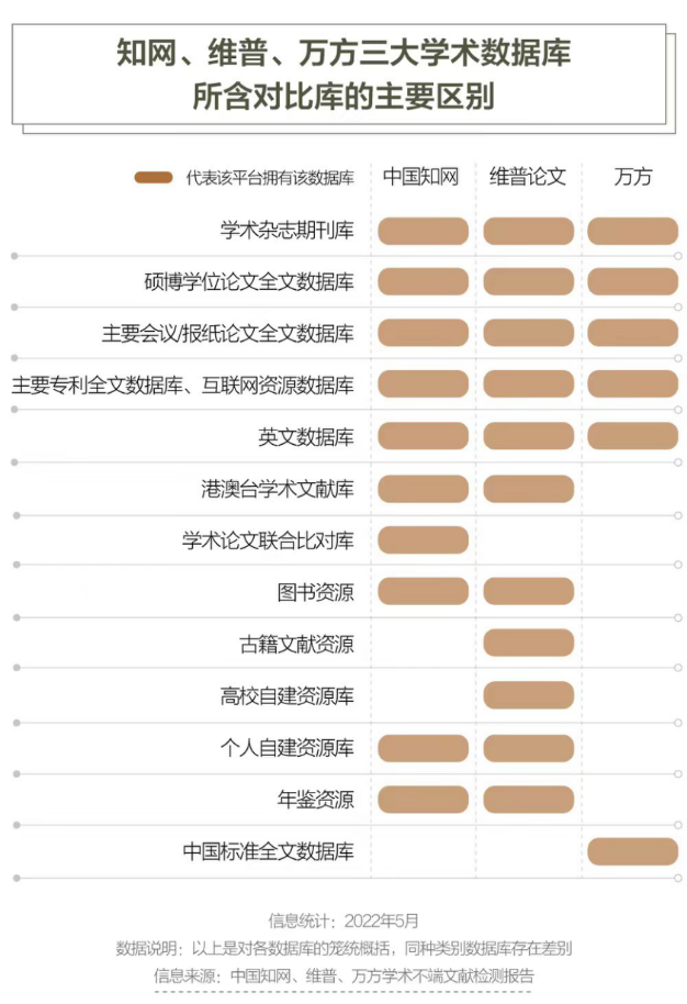 查重的基本方法,实际就是将论文同数据库中的学术文章作文本相似性的对比,所以,存有的论文数量,拥有何种类型的资源库,都会影响到被检测论文的重复率。在知网、万方、维普的检测报告中,会显示它们各自的检测范围。通过粗略分类,可以看出不同数据库之间存在的差别。这就意味着,不同的查重平台,得出的查重率可能会存在很大出入。
