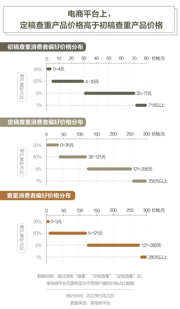通过消费者偏好的价格,我们可以了解到,消费者购买初稿查重的服务价格集中在4-30元,定稿的集中在36-121元。但是,许多毕业生可能会重复多次购买初稿、定稿查重服务。这样看来,毕业生为了查重,实际花费可能远不止这些。根据媒体报道,曾有学生前后修改四次毕业论文,前后查重花费达到了1000多元。同时,学生还可能遭遇频繁涨价的情况。