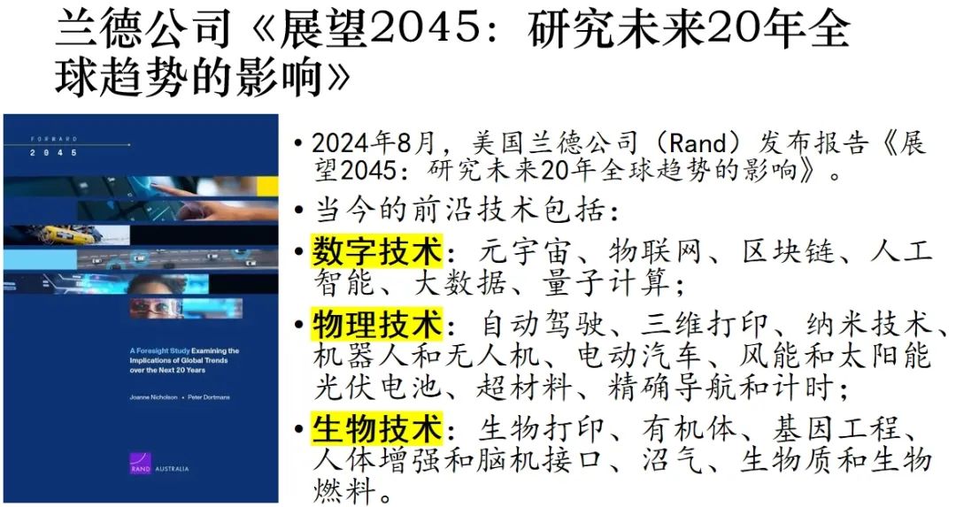 蓝德公司《展望2045:研究未来20年全球趋势的影响》讲到,当今的前沿技术包括:数字技术、物理技术、生物技术。这三大技术应该说大部分都跟图书馆有关系,所以这也是图书馆“十五五”智慧图书馆建设的着眼点。