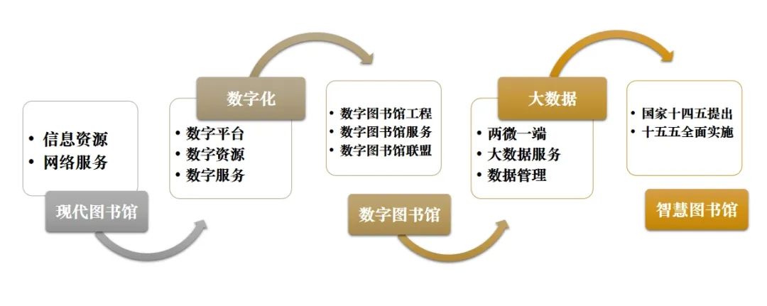 随着技术发展,现代图书馆从数字化到数字图书馆到大数据服务再到智慧图书馆,是必然的发展趋势,国家“十四五”规划提出“智慧图书馆体系建设取得明显进展”,“十五五”将是全面实施智慧图书馆建设的阶段。