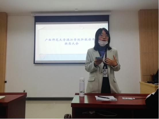 金菊含笑、秋风送爽,在这个美好的日子里,弘毅读书社迎来了一年一度的换届大会。本次会议于9月27日17:20分在漓江学院图书馆三楼报告厅举行。弘毅社团指导老师谢春双及2018级会干担任评委。