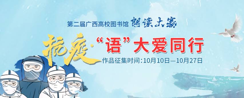 2020年,山河无恙,共克时艰。为进一步激发广大高校学子的爱国信念,充分展现当代大学生在疫情面前一往无前的勇敢担当和责任,诠释新 时代大学生的青春风貌,赞美抗疫期间的英雄故事和他们大无畏的奉献精 神,树立积极向上的正能量学习榜样,广西高教学会图书馆专业委员会决 定在全区各高等院校图书馆范围内开展“抗疫-'语'大爱同行"第二届广 西高校图书馆朗读大赛。