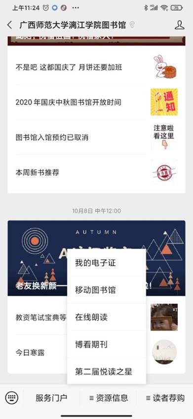 (2) 博看朗读小程序参赛:关注图书馆微信公众号,从底部菜单进入“资源信息”中的“在线朗读”博看朗读小程序,现在朗读亭参赛或手机朗读参赛。