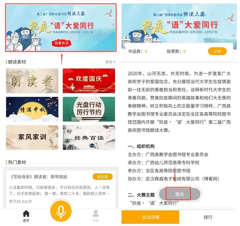 参赛方式:关注图书馆微信公众号,从底部菜单进入“资源信息”中的“在线朗读”博看朗读小程序,现在朗读亭参赛或手机朗读参赛。