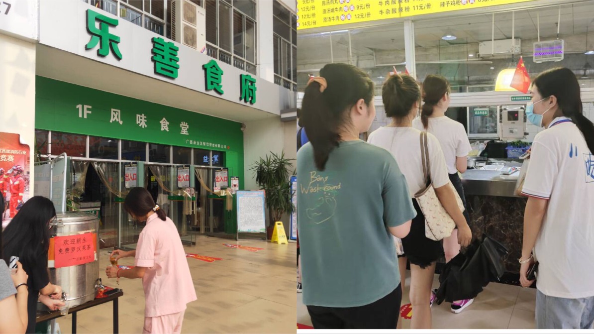 为迎新食堂赠饮凉茶,精心准备营养丰富、种类繁多的菜肴,组织志愿者有序维持食堂就餐秩序,引导新生有序排队,文明用餐。