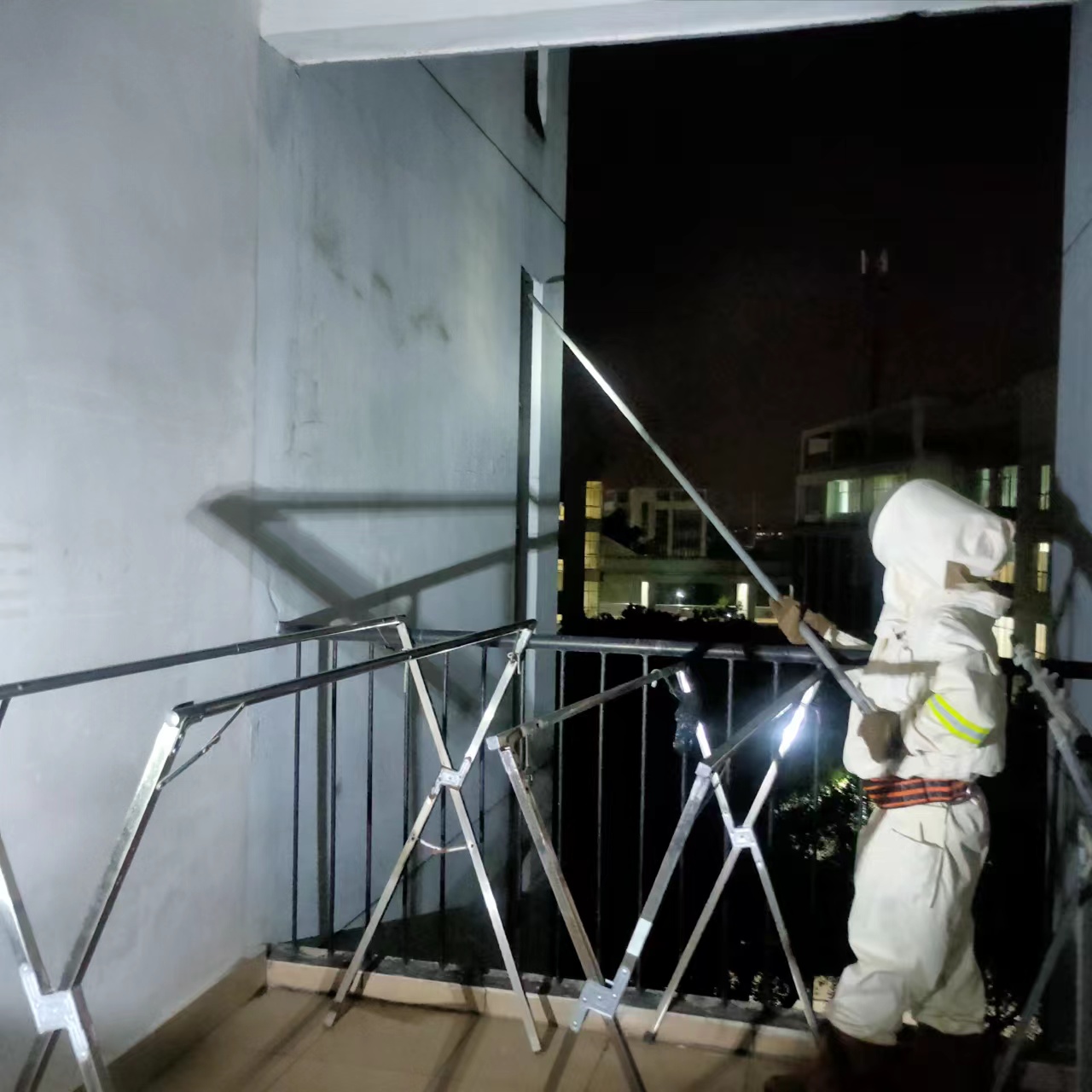 9月15日后勤保卫处邀请雁山区消防大队对我校多个马蜂窝进行统一清理,消防队员到校仔细勘察现场并制定好方案,保卫人员配合做好现场安全管制。在清理过程中,消防指战员身着专业防护服,做好个人防护措施后,采用高压水冲、杀虫剂喷洒等方式清理马蜂窝5个,清除了校园安全隐患,为师生营造安全的学习和生活环境。