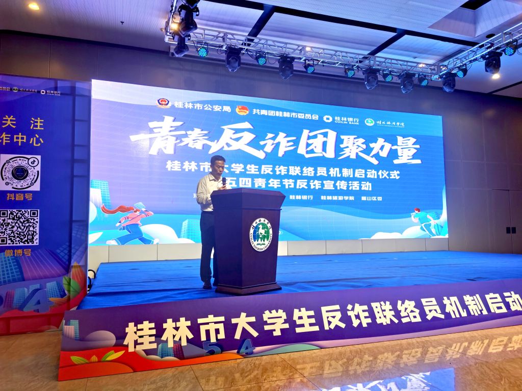 为进一步提高大学生的反诈意识,切实保障学生的财产安全,4月27日,桂林市大学生反诈联动员机制启动仪式暨五四青年节反诈宣传活动在桂林旅游学院举行。我校积极响应号召,组织师生代表50人参与此次活动,共同为构建平安校园、营造全民反诈的良好氛围贡献力量。