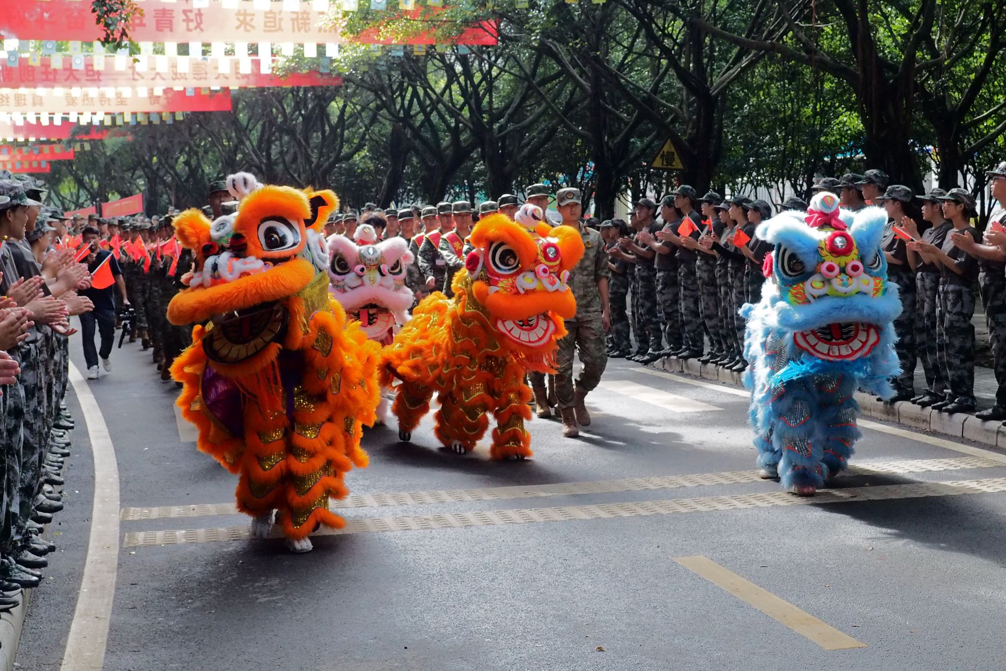 新兵即将离校之际,正在进行军训的2025级新生分列臻善环道两旁,手挥国旗、唱着军歌参与到欢送行列。来自学校龙狮运动协会的同学们舞着醒狮,时而腾跃蹦跳,时而昂首摆尾,来回穿梭在欢送队伍中,为即将踏上军旅征程的新兵们送上不负时代、不负韶华、早传捷报的美好祝愿。