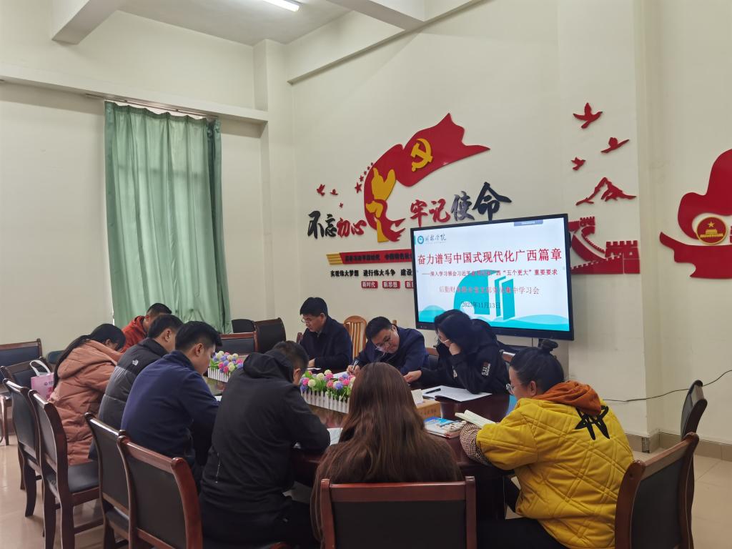 方琬瑜老师以“奋力谱写中国式现代化广西篇章—深入学习领会习近平总书记对广西“五个更大”重要要求”为主题组织全体党员一起学习,从“五个更大”重要要求的精神实质和核心要义与奋力开创新时代壮美广西建设新局面两方面进行讲解,强调牢记领袖嘱托、勇担历史使命,把“五个更大”重要要求贯彻落实到广西改革发展各领域全过程。