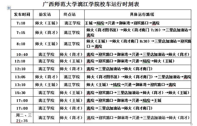 一、3月1日--5日取消原校车8:10(王城--育才--漓院)、10:40(漓院--育才)、15:30(漓院--育才--王城)、21:35(漓院--育才)班次,其余车次不变;3月8日起按照广西师范大学漓江学院校车运行时刻表正常运行。具体详见校车运行时刻表。