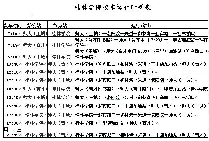 一、11月10--11日取消8:10(师大王城--师大育才--桂林学院)、10:40(桂林学院--师大育才)、15:30(桂林学院--师大育才--师大王城)班次,其余车次不变。具体详见桂林学院校车运行时刻表。